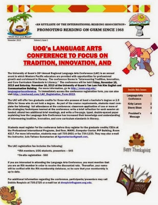 The 26th Annual Regional Language Arts Conference held November 15 and 16, 2013 at UOG's Tan Lam Pek Kim English and Communication Building was engaging! The conference theme was Interweaving Tradition, Innovation, and Core Curriculum Standards in Literacy.The literacy-filled presentations and keynote speech by former Guam Department of Education Superintendent, Dr. Nerissa Bretania Underwood, was insightful. Drs. George Kallingal and Margaruite Smith also served as plenary speakers with inspirational messages. Enjoy the following snapshots!
